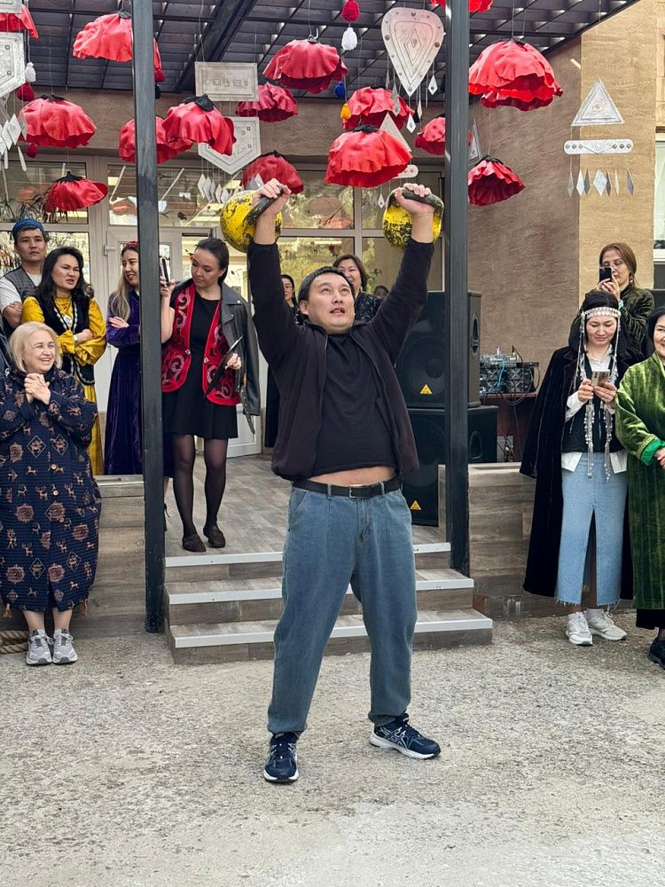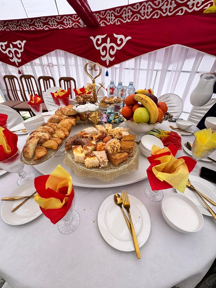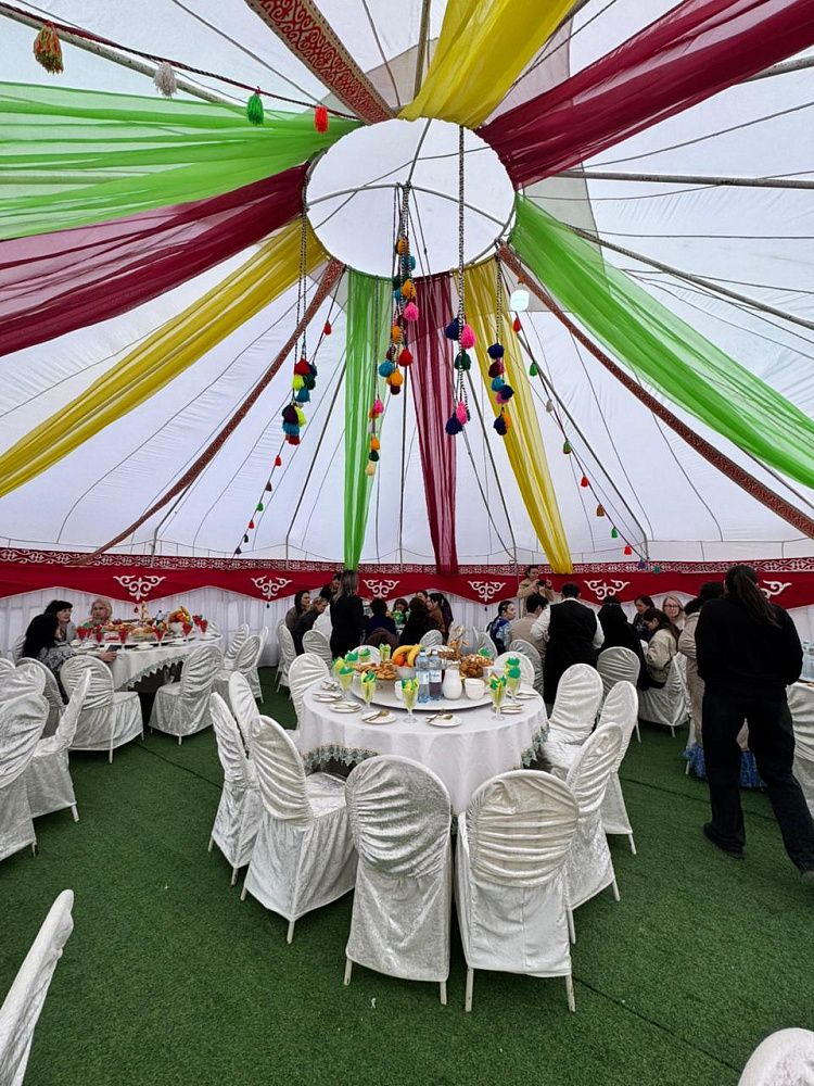 Для гостей был организован красочно оформленный шатёр в стиле традиционной казахской юрты, украшенный национальными орнаментами и яркими тканями. Центральным элементом праздника стал щедрый дастархан с баурсаками, национальными сладостями, фруктами и другими угощениями, символизирующими достаток и обновление.